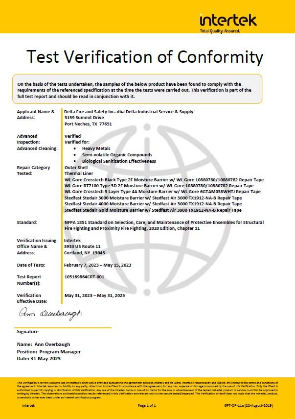 Delta has been verified to perform advanced inspection and cleaning services on structural and proximity garment elements and technical rescue garment elements. Verification includes a review of the quality management system, procedures and documentation, and random unannounced visits to ensure continued compliance.