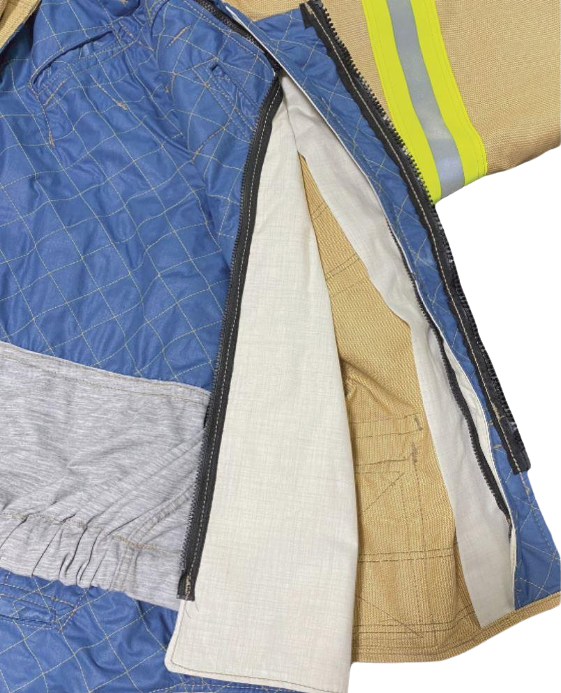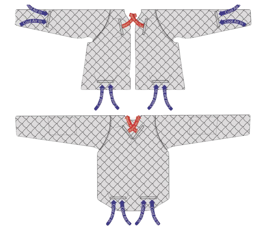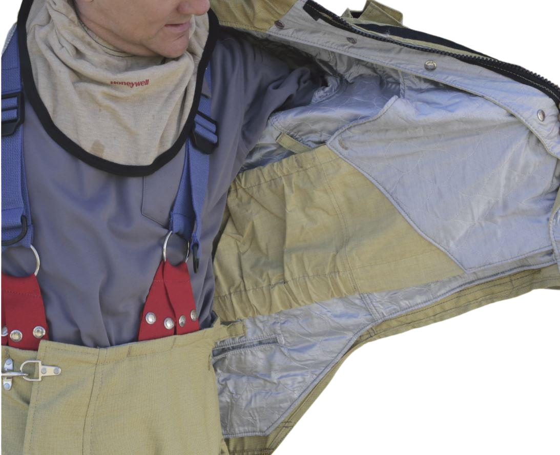 This is the latest patent-pending design feature designed to minimize firefighter heat stress by providing vents that allow warm/moist air normally trapped inside the liner to rise and escape at the chest and shoulder blades through vents. As the warm air escapes when the collar and top of coat closure are opened, cooler/drier air enters through the four liner vents at the bottom of the coat.